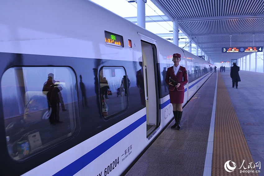 第一站:7点46分列车到达保定东站,列车长李娜下车立岗,车厢内很多旅客正在酣睡全然不知列车进站。(人民网记者 关腾飞 摄)图片来源:人民网
