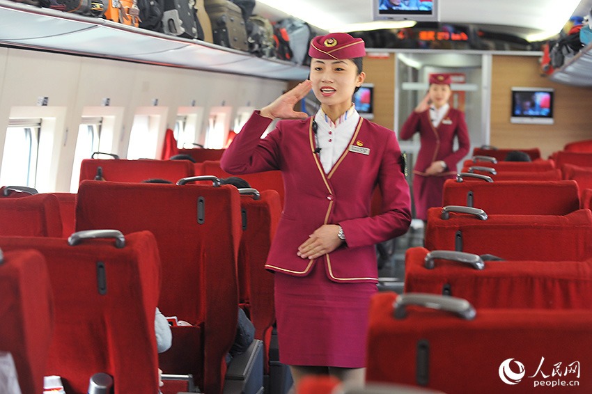 防耳鸣操:11点14分列车从洛阳龙门发车后进入多隧道路段,为缓解列车穿梭隧道时给旅客带来的不适,列车长李娜开始逐节车厢为旅客示范自创的防耳鸣操。(人民网记者 关腾飞 摄)图片来源:人民网