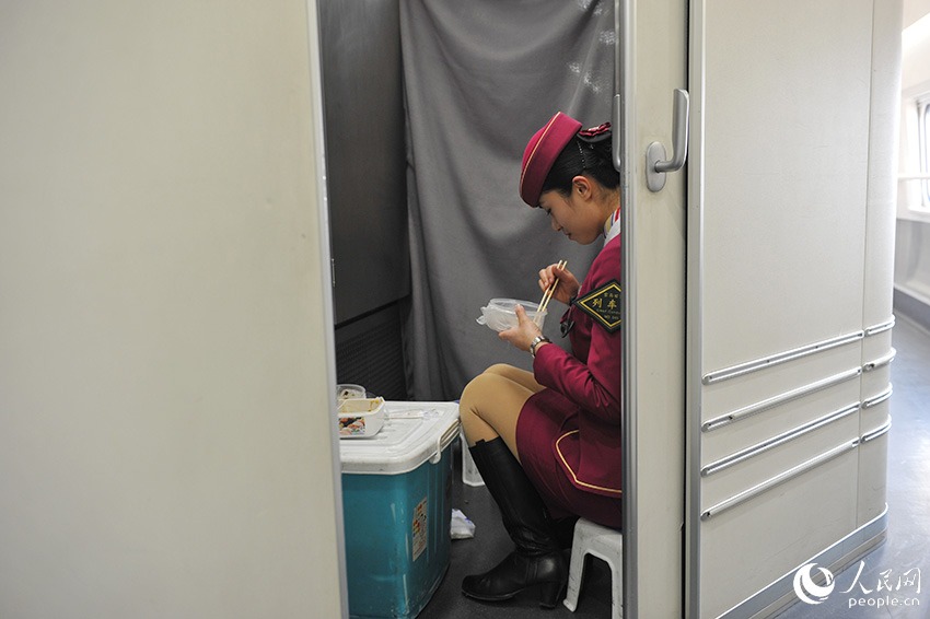 第一餐:14点左右,列车长李娜抽出时间在餐吧内搭上帘子开始吃午饭。这是她唯一一次在列车上坐下“休息”。(人民网记者 关腾飞 摄)图片来源:人民网