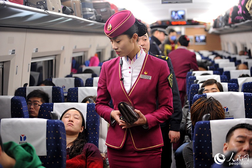 善意提醒:列车快到北京西站,列车长李娜最后一次巡视车厢,她不时的提醒熟睡旅客列车即将进站不要忘记携带随身物品。(人民网记者 关腾飞 摄)图片来源:人民网