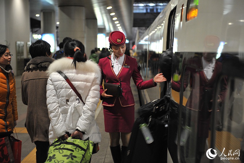 工作12小时,再出发:17点50分列车到达北京西,18点16分列车长李娜将再随车到石家庄。她面带微笑迎接下一批乘客上车。(人民网记者 关腾飞 摄)图片来源:人民网