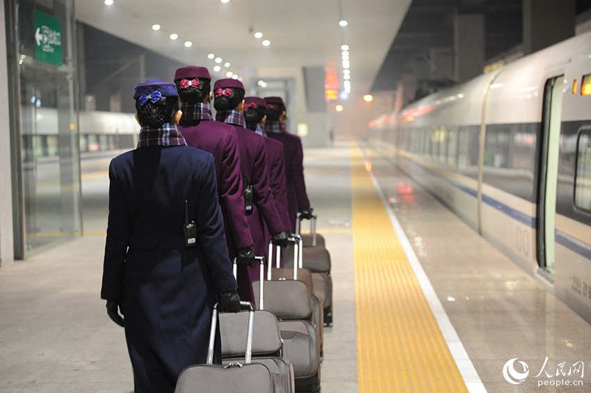 暮色归途:21点57分列车G6710由石家庄返回北京西站,列车长李娜与列车员整理完行装返回员工宿舍。明日清晨5点她们会再次投入工作,为”春运“归家的旅客带来热情的服务、温馨的体验。(人民网记者 关腾飞 摄)图片来源:人民网