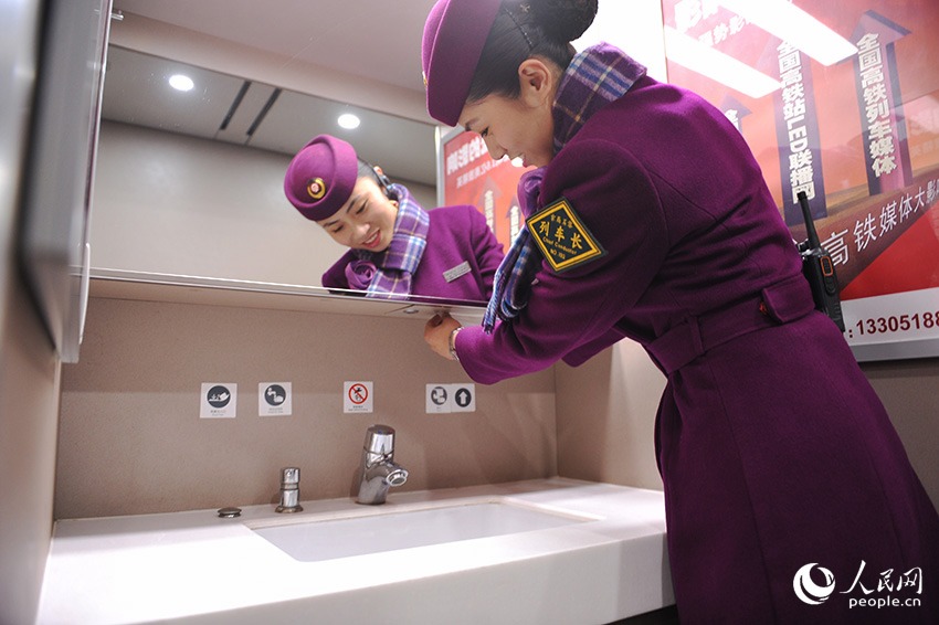 车厢内检查:6点09分,列车工作人员上车。列车长李娜开始检查车厢内设施,巡查全车准备情况。(人民网记者 关腾飞 摄)图片来源:人民网