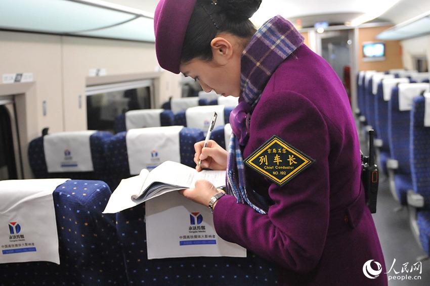 “无处不在”:与列车警长检查灭火器、与随车机械师检查上水、与保洁人员确认清洁情况、规范乘务员服务标准。短短几十分钟百米车厢内随处可见列车长李娜的身影。(人民网记者 关腾飞 摄)图片来源:人民网