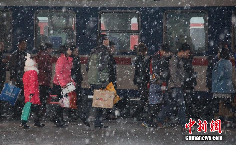 2月5日,陕西省西安市,旅客在西安火车站站台上冒雪排队乘车。唐振江 摄 图片来源:中新网
