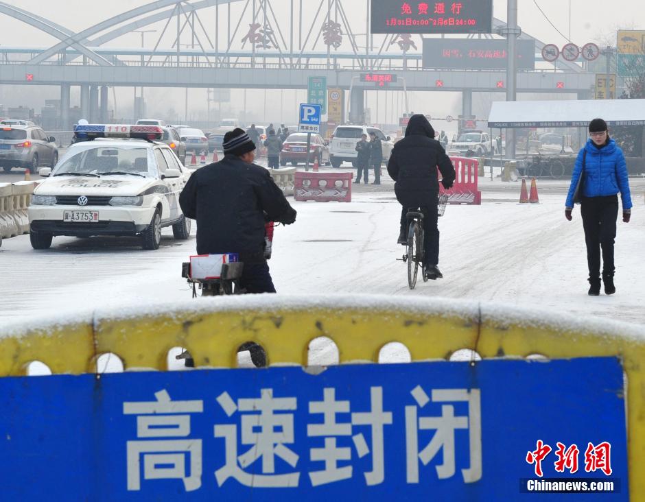 2月6日是正月初七,春节假期的最后一天,依旧处于春运返程高峰期。据中央气象台预报,2月6日至8日,中东部地区有大范围雨雪天气,温度继续下降。受恶劣天气影响,河北部分地区出现道路结冰,造成京港澳、京昆、大广、石黄高速等12条高速公路封闭,给公路交通出行带来不利影响。图为石家庄京港澳裕华高速路口封闭。中新社发 翟羽佳 摄