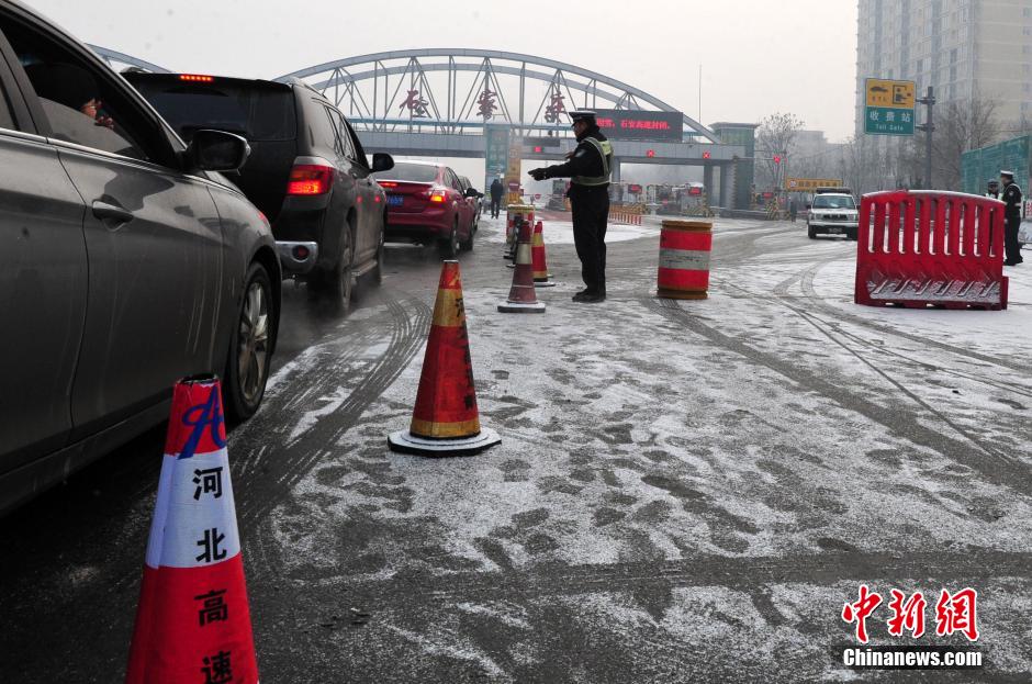2月6日是正月初七,春节假期的最后一天,依旧处于春运返程高峰期。据中央气象台预报,2月6日至8日,中东部地区有大范围雨雪天气,温度继续下降。受恶劣天气影响,河北部分地区出现道路结冰,造成京港澳、京昆、大广、石黄高速等12条高速公路封闭,给公路交通出行带来不利影响。图为石家庄京港澳裕华高速路口封闭,警方指挥车辆。中新社发 翟羽佳 摄
