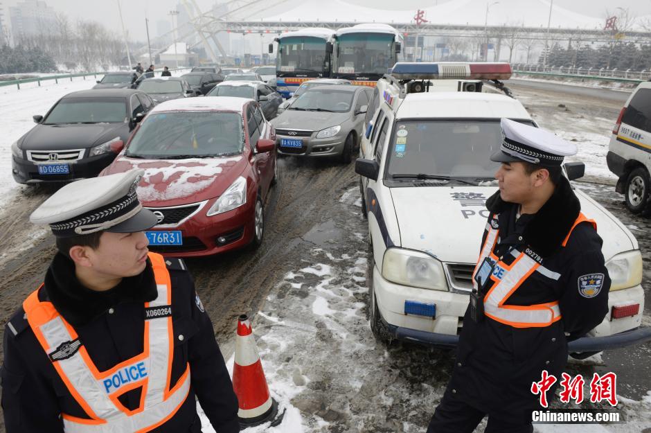 2月6日,山西太原长风高速口,高速交警等候私家车集结,实行警车带道护送旅客返程。据中央气象台预报,2月6日至8日,中东部地区有大范围雨雪天气造成京港澳、京昆、大广、石黄高速等12条高速公路封闭,给公路交通出行带来不利影响。中新社 韦亮 摄