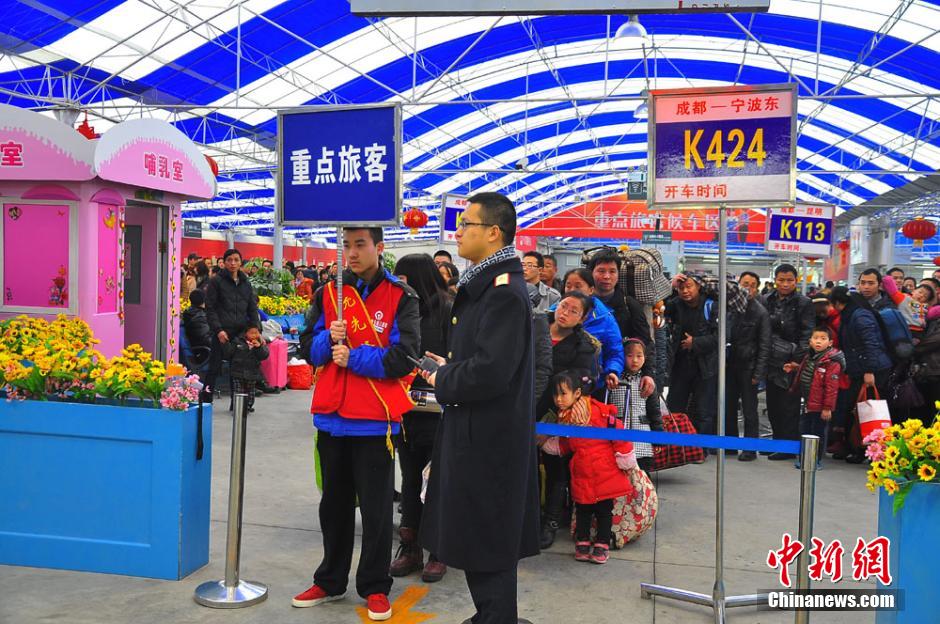 2月6日是农历正月初七,在春节假期即将结束之际,成都铁路进入春节返程客流高峰。图为在成都火车站临时候车室,重点旅客在铁路工作人员指引下准备进站上车。胡志强 摄