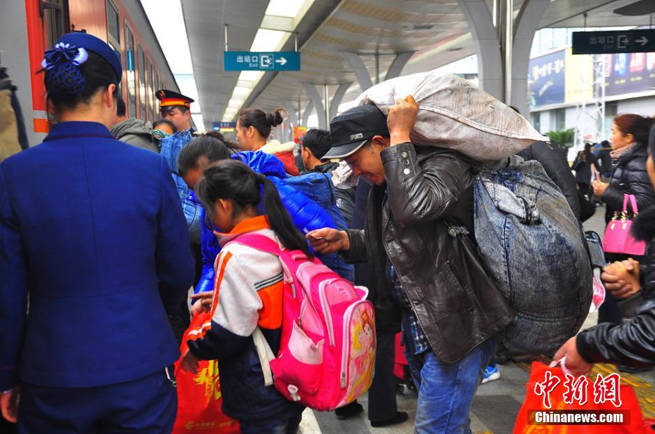 2月6日是农历正月初七,在春节假期即将结束之际,成都铁路进入春节返程客流高峰。图为在成都火车站一站台,返程的旅客正有序排队上车。胡志强 摄