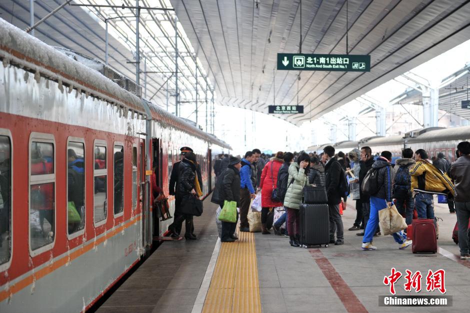 2月6日正月初七,2014全国春运迎来返程客流高峰。当日,北京西站预计到达旅客18.9万人,为了迎接返程高峰,西站将节前盯守的重点部位进站口调整为站台和出站口,在站台组织了10人的乘降小分队。同时,西站地铁站和出租车调度站都加派人手疏导旅客。另外,此前受中东部地区雨雪影响,京沪、京广、郑西高铁部分区段限速运行,致使多趟抵京的高铁列车晚点。图为北京西站进站列车上仍带着雪迹。中新网记者 金硕 摄