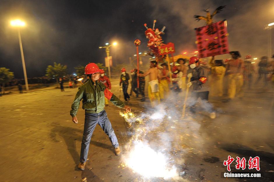 2月10日晚,农历正月十一,广西宾阳县迎来一年一度的炮龙节,当地政府响应中央有关从简办节办会压缩节庆规模,但数万民众仍在轰轰烈烈的爆竹声中狂欢,燃炮逐龙热度不减。据介绍,台湾盐水蜂炮二度来到宾阳,与当地炮龙文化进行交流。宾阳炮龙也将于元宵节赴台湾参加台南盐水蜂炮活动,届时广西非物质文化遗产——宾阳游彩架也将首度亮相宝岛台湾。图为宾阳炮龙。中新社发 洪坚鹏 摄