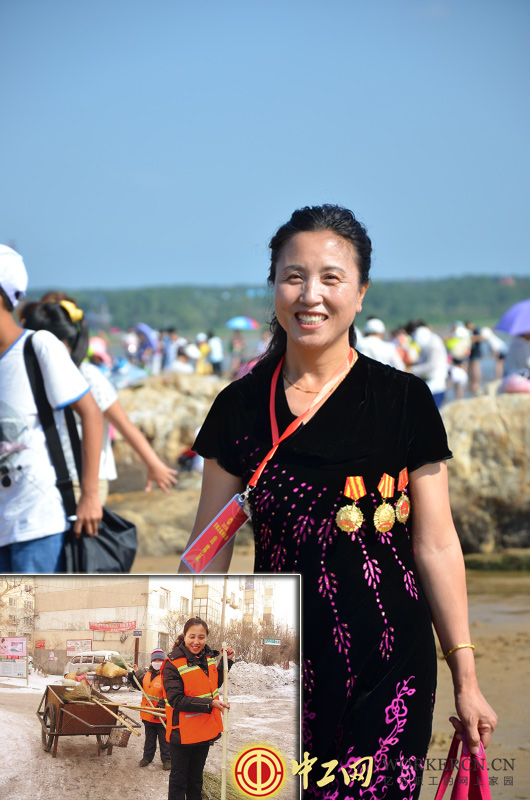 图为2013年7月30日,全国劳模、哈尔滨市道外区清扫保洁一队副队长马素丽参加北戴河劳模休养活动中在鸽子窝公园的留影。(摄影:笑语)