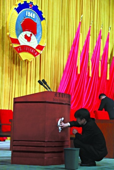 1月16日,工作人员在布置大会会场,发言台上和主席台前都没有摆放鲜花。