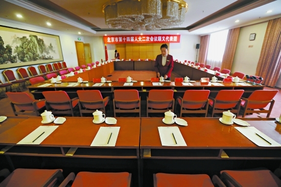 1月16日上午,北京会议中心,服务员在布置市人代会分组会会场。会议桌上只有纸笔和普通茶具,鲜花和手巾都不见了踪影。