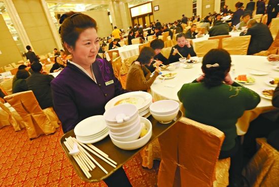 1月16日,在北京会议中心餐厅,参加市十四届人大二次会议的代表们按量取餐,杜绝浪费。服务员每次撤下的都是一个个光盘。