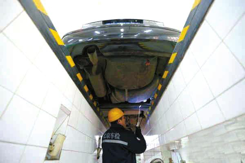 昨天,在北汽修理公司大屯检测场,检验员检查车辆底盘。京华时报记者王海欣摄