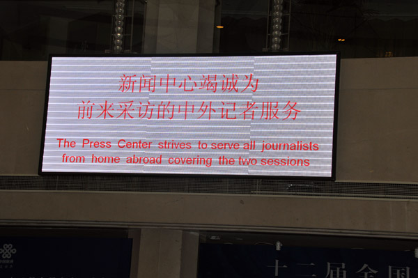 2014年全国“两会”新闻中心上方的显示屏 高国全 摄
