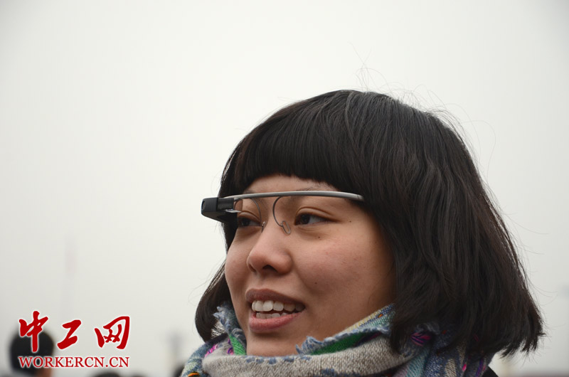 2014年3月3日下午,全国政协十二届二次会议在北京人民大会堂开幕。在人民大会堂广场一位记者佩戴谷歌眼镜采访,据了解此眼镜和智能手机一样的功能,可以通过声音控制拍照。 (中工网记者 笑语摄)