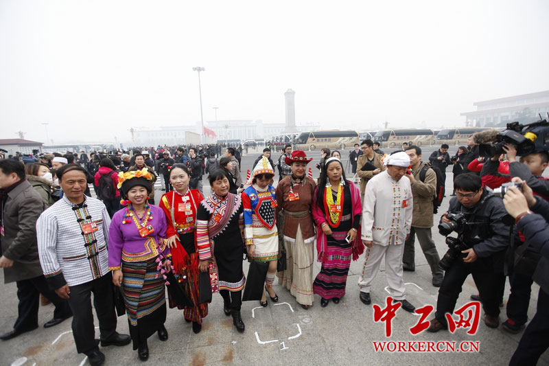 3月3日,中国人民政治协商会议第十二届全国委员会第二次会议在北京人民大会堂开幕。图为少数民族委员步入会场。 中工网记者 韩靖摄