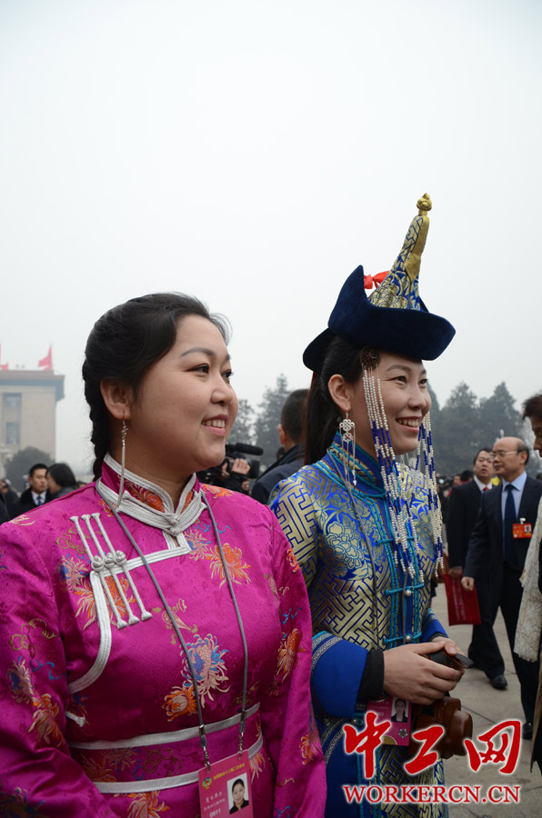 2014年3月3日下午3时,全国政协十二届二次会议在人民大会堂举行开幕会。来自少数民族地区、身着民族服饰的全国政协委员和一起赴京采访的记者成为两会会场外一道亮眼的风景。 (中工网记者 笑语摄)