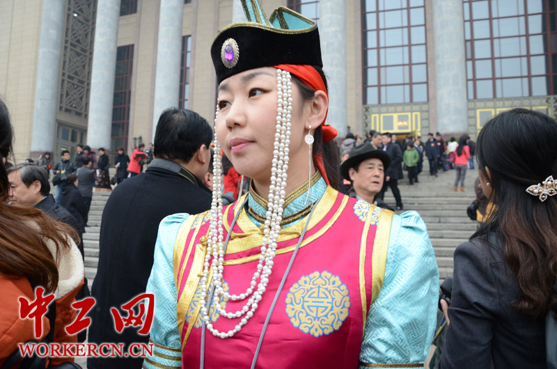 2014年3月3日下午3时,全国政协十二届二次会议在人民大会堂举行开幕会。来自少数民族地区、身着民族服饰的全国政协委员和一起赴京采访的记者成为两会会场外一道亮眼的风景。 (中工网记者 笑语摄)