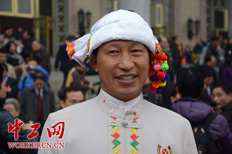 2014年3月3日下午3时,全国政协十二届二次会议在人民大会堂举行开幕会。来自少数民族地区、身着民族服饰的全国政协委员和一起赴京采访的记者成为两会会场外一道亮眼的风景。 (中工网记者 笑语摄)