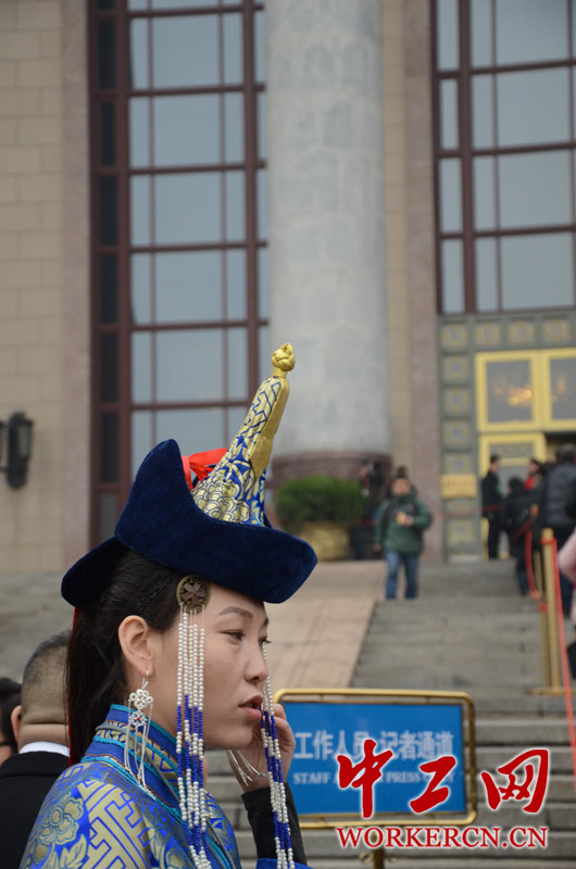 2014年3月3日下午3时,全国政协十二届二次会议在人民大会堂举行开幕会。来自少数民族地区、身着民族服饰的全国政协委员和一起赴京采访的记者成为两会会场外一道亮眼的风景。 (中工网记者 笑语摄)