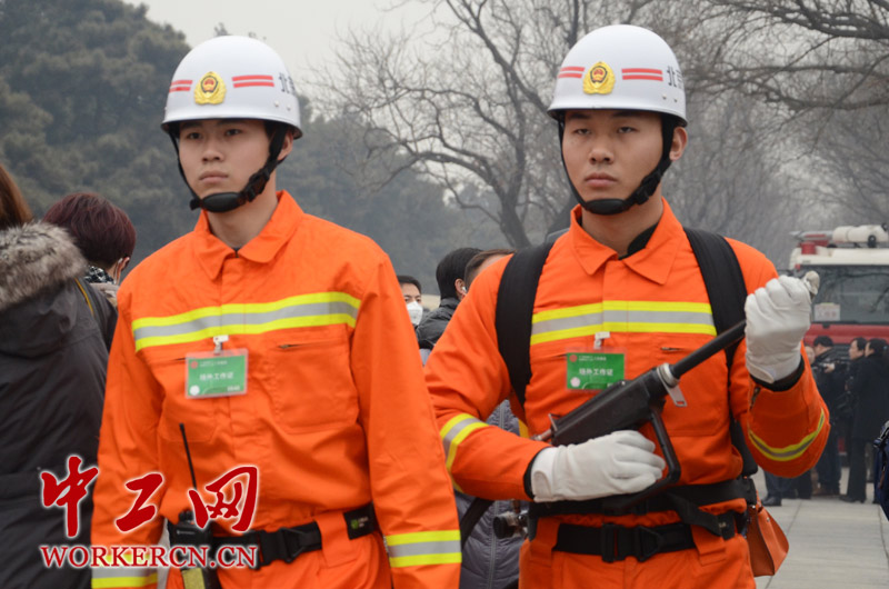 3月3日,全国政协十二届二次会议开幕,天安门、人民大会堂及周边地区安保全面升级。图为北京天安门广场,消防战士正在巡逻。 (中工网记者 笑语摄)