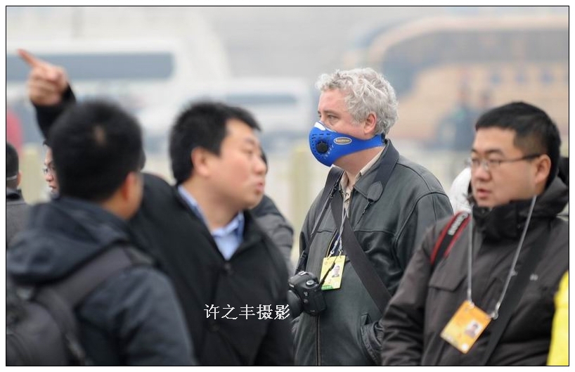 2014年3月3日下午,北京城被雾霾天气笼罩,在北京天安门广场,参加全国政协十二届二次会议开幕式的工作人员和委员们许多都戴上口罩,成为今年两会第一天新的一景。工人日报-中工网记者许之丰摄影报道