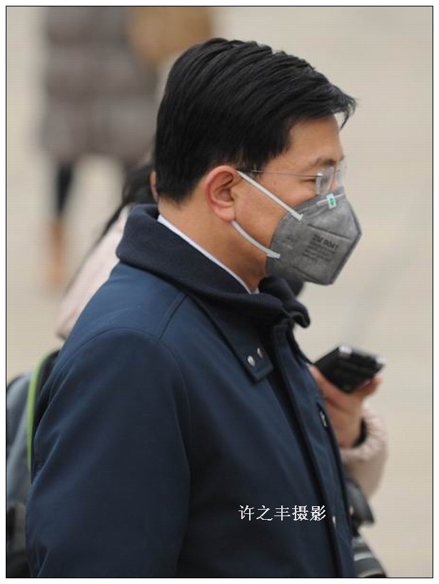 2014年3月3日下午,北京城被雾霾天气笼罩,在北京天安门广场,参加全国政协十二届二次会议开幕式的工作人员和委员们许多都戴上口罩,成为今年两会第一天新的一景。工人日报-中工网记者许之丰摄影报道