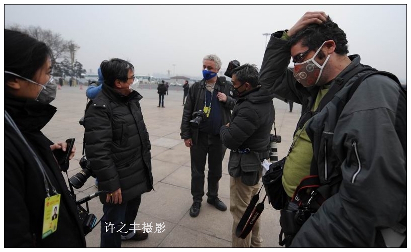 2014年3月3日下午,北京城被雾霾天气笼罩,在北京天安门广场,参加全国政协十二届二次会议开幕式的工作人员和委员们许多都戴上口罩,成为今年两会第一天新的一景。工人日报-中工网记者许之丰摄影报道
