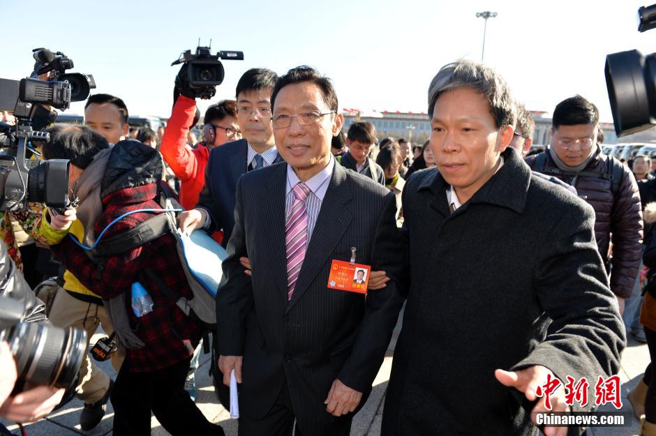 3月4日,十二届全国人大二次会议在北京人民大会堂举行预备会议。参会的全国人大代表、中国工程院院士钟南山被媒体记者追访提问。中新社发 骆云飞 摄