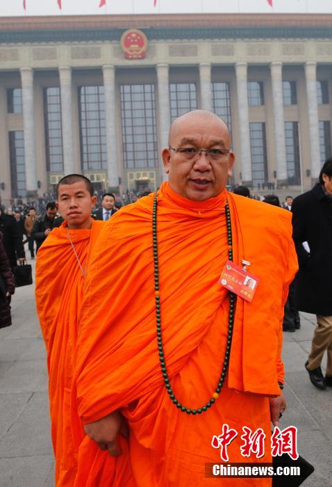 3月3日15时,中国人民政治协商会议第十二届全国委员会第二次会议在人民大会堂开幕。开幕会后,来自云南的祜巴龙庄勐委员走出会场。中新社发 杜洋 摄