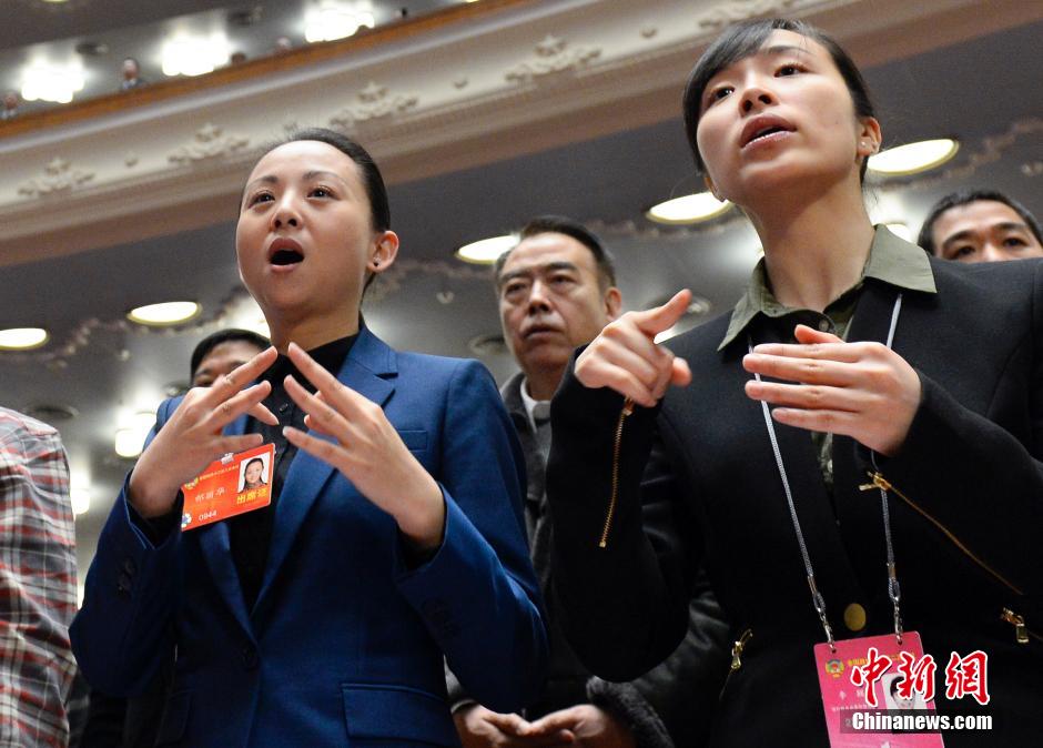3月3日15时,中国人民政治协商会议第十二届全国委员会第二次会议在人民大会堂开幕。邰丽华委员(左)用手语“唱”国歌。中新社发 刘震 摄