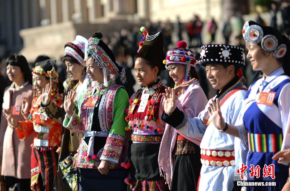 3月4日上午,十二届全国人大二次会议举行预备会议,选举大会主席团和秘书长,表决会议议程草案。图为少数民族代表参会。中新社发 廖攀 摄