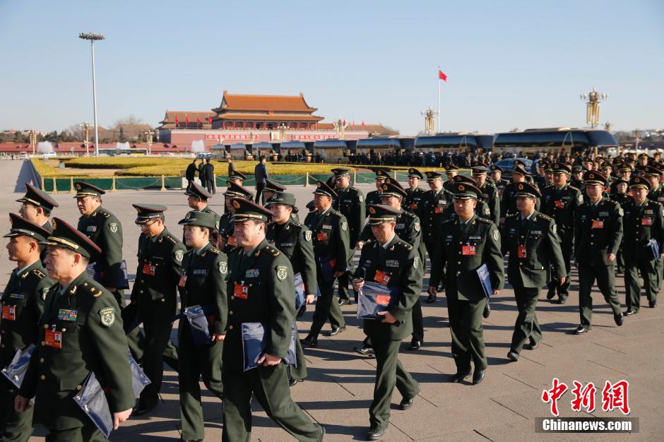 3月4日,十二届全国人大二次会议在北京人民大会堂举行预备会议。图为解放军代表团步入会场。中新社发 杜洋 摄