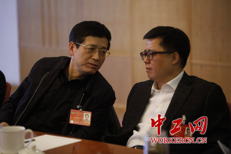 在全国政协十二届二次会议小组讨论会上,工会界别政协委员热议政协全国委员会常务委员会工作报告和政协全国委员会常务委员会关于政协十二届一次会议以来提案工作情况的报告。工会界别政协委员杨建祥(左)、管飞(右) 互相交流。中工网记者 韩靖摄