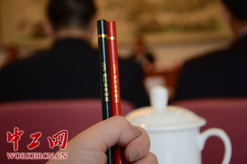 3月4日,全国政协各界别的委员进行分组讨论。记者在会场内发现,住地宾馆内为政协委员参会提供了各种贴心、环保的服务。大会为每位委员仅提供2张纸和由废旧报纸制成的环保铅笔,整个会场也未见一次性纸杯。会场外的衣架和各式文具也体现出驻地宾馆服务的周到、贴心。 (中工网记者 笑语摄)