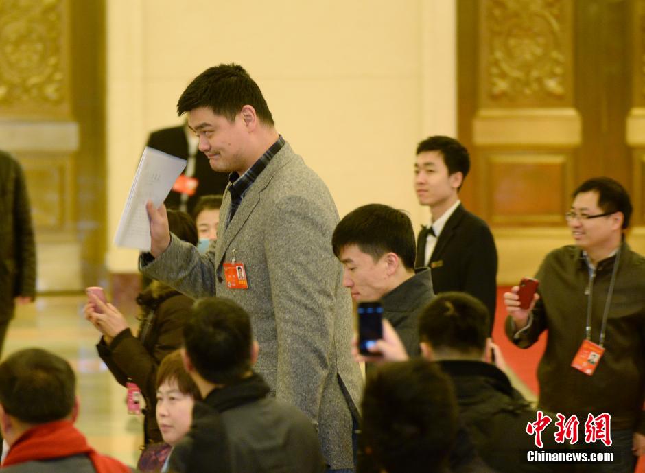 3月5日,十二届全国人大二次会议开幕会在北京人民大会堂举行。全国政协委员姚明、刘翔一起入场。中新社发 侯宇 摄