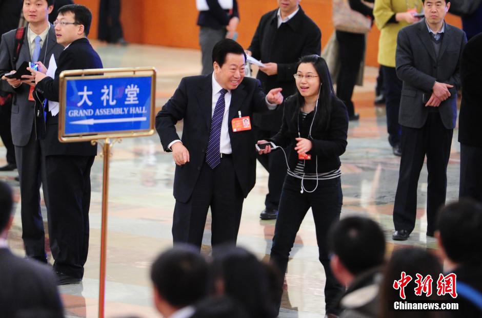 3月5日上午9时,第十二届全国人民代表大会第二次会议在北京人民大会堂开幕。女记者追访环保部部长周生贤。中新社发 杨华峰 摄