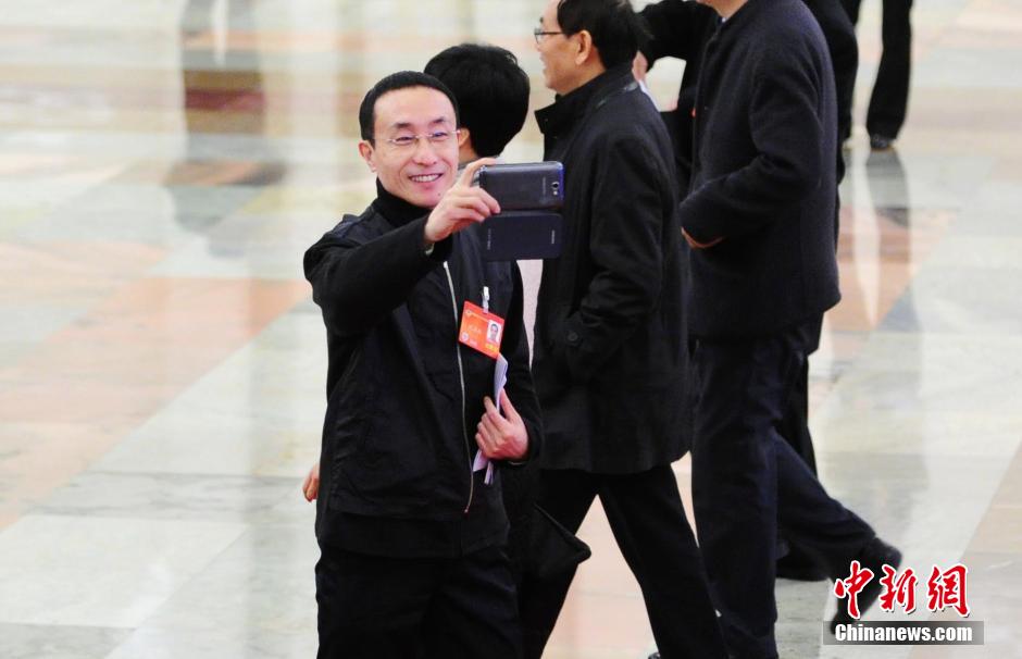 3月5日,第十二届全国人民代表大会第二次会议在北京人民大会堂开幕。全国政协委员巩汉林用手机拍摄记者现场采访。中新社发 杨华峰 摄