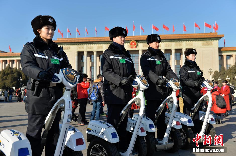 3月5日,第十二届全国人民代表大会第二次会议在北京人民大会堂开幕。警察骑电动车在天安门广场巡逻。中新社发 骆云飞 摄