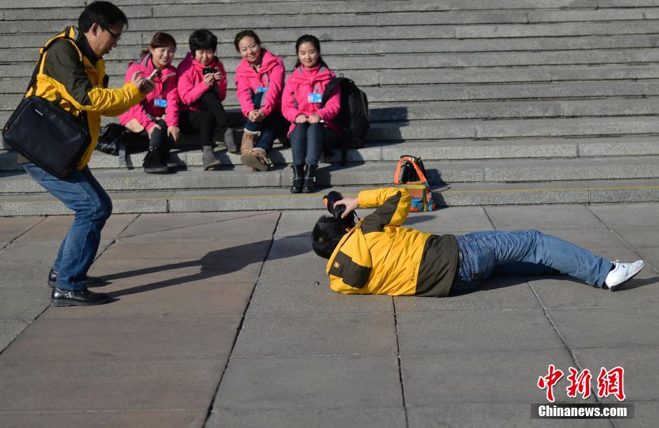3月5日上午,第十二届全国人民代表大会第二次会议在人民大会堂开幕。场外摄影者躺在地上拍照。中新社发 廖攀 摄