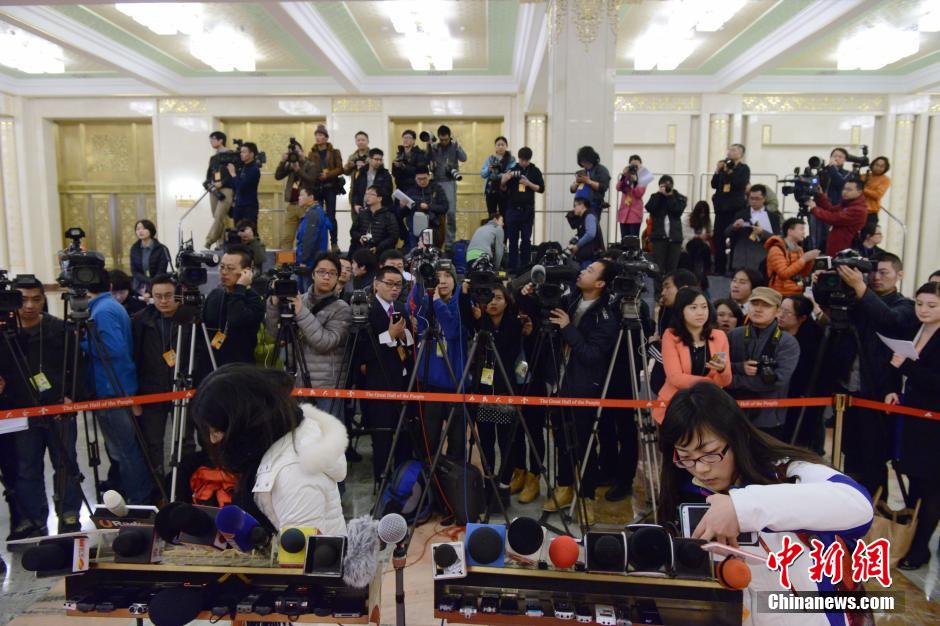 3月5日,第十二届全国人民代表大会第二次会议在北京人民大会堂开幕。记者等候采访各部部长,新闻大战达到高潮。中新社发 杨华峰 摄