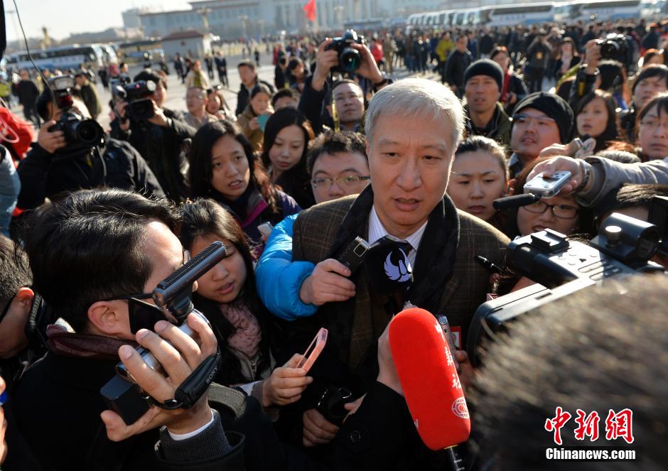3月5日,第十二届全国人民代表大会第二次会议在北京人民大会堂开幕。全国政协委员、前国家知识产权局局长田力普被众多记者围堵追访。中新社发 骆云飞 摄