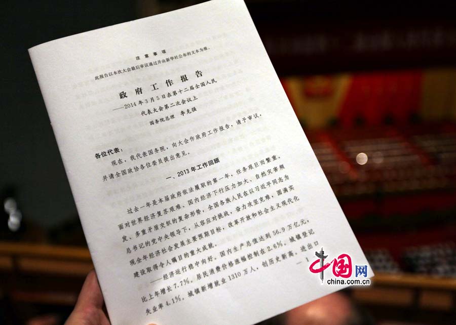 3月5日上午第十二届全国人民代表大会第二次会议在人民大会堂开幕。图为政府工作报告。郑亮 摄 图片来源:中国网
