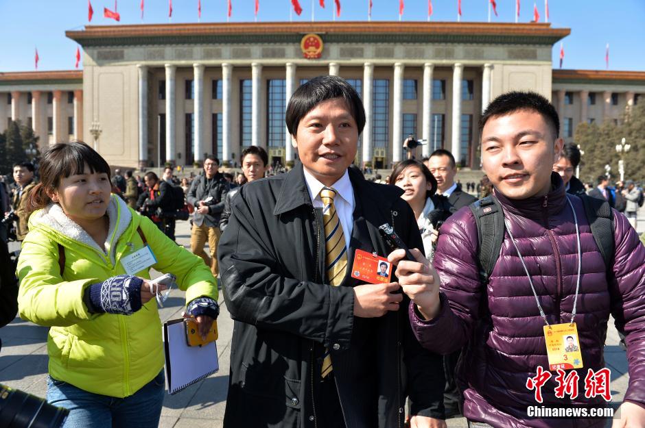 3月5日,第十二届全国人民代表大会第二次会议在北京人民大会堂开幕。全国人大代表、小米科技总裁雷军走出会场后被记者追访。中新社发 骆云飞 摄