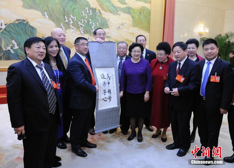 3月5日,全国政协副主席李海峰(前右五)在北京会见美国联邦储备委员会高级顾问龚锦等35位列席全国政协十二届二次会议的海外侨胞代表。来自澳大利亚的侨胞代表祝敏申向李海峰赠送了自己创作的书法作品。中新社发 侯宇 摄