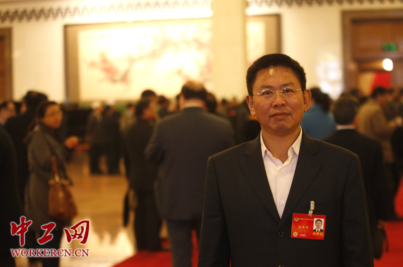 2014年3月9日,全国政协委员、2010年全国劳动模范、赣州华坚国际鞋城有限公司董事长张华荣在人民大会堂出席全国政协第十二届二次会议第四次全体会。 (中工网记者 韩靖摄)